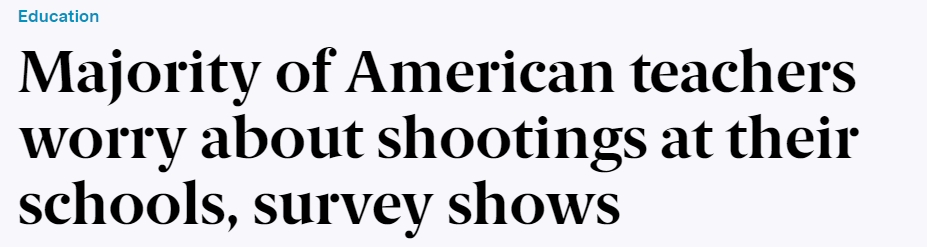 美國獨立新聞媒體The 19th 網站11日報道稱,根據皮尤研究中心一項新的調查,絕大多數美國K-12公立學校的教師在一定程度上擔心學??赡軙l(fā)生槍擊事件。并且,多數教育工作者贊成對學生們進行更多心理健康篩查和治療并反對教職工配槍上班。