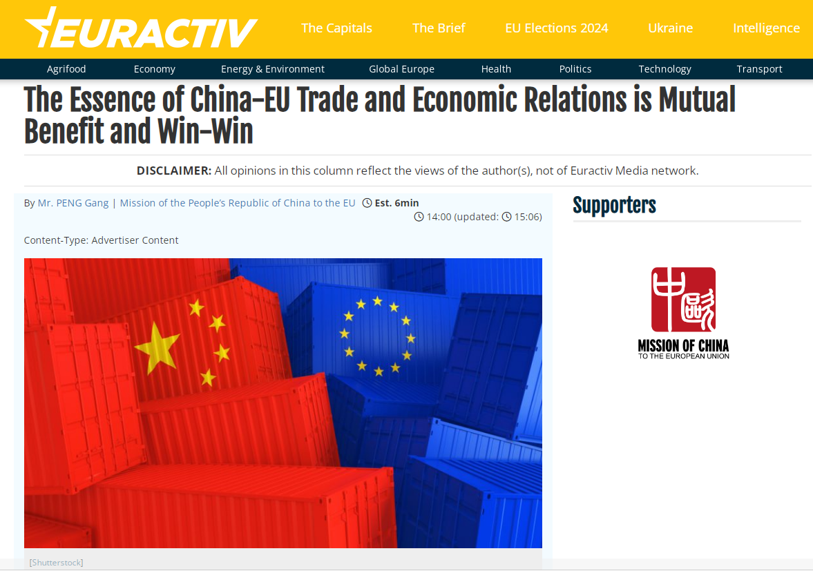 對此,中國駐歐盟使團負責經貿事務的公使彭剛在歐洲知名媒體“歐盟動態(tài)”發(fā)表題為《中歐經貿關系的本質是互利共贏》的署名文章。文章強調,“去風險”不應成為“去機遇”。中國始終認為中歐經濟具有高度互補性,中國超大規(guī)模市場和歐洲4.5億人口的統(tǒng)一大市場,是彼此經濟發(fā)展的巨大機遇。當前,“去風險”成為歐盟對華經貿政策的重點。我們理解各方都有自己的關切,重要的是如何合理地界定和防范風險。中方反對將經濟問題政治化、意識形態(tài)化、泛安全化,使“去風險”變成“去機遇”和“去合作”。