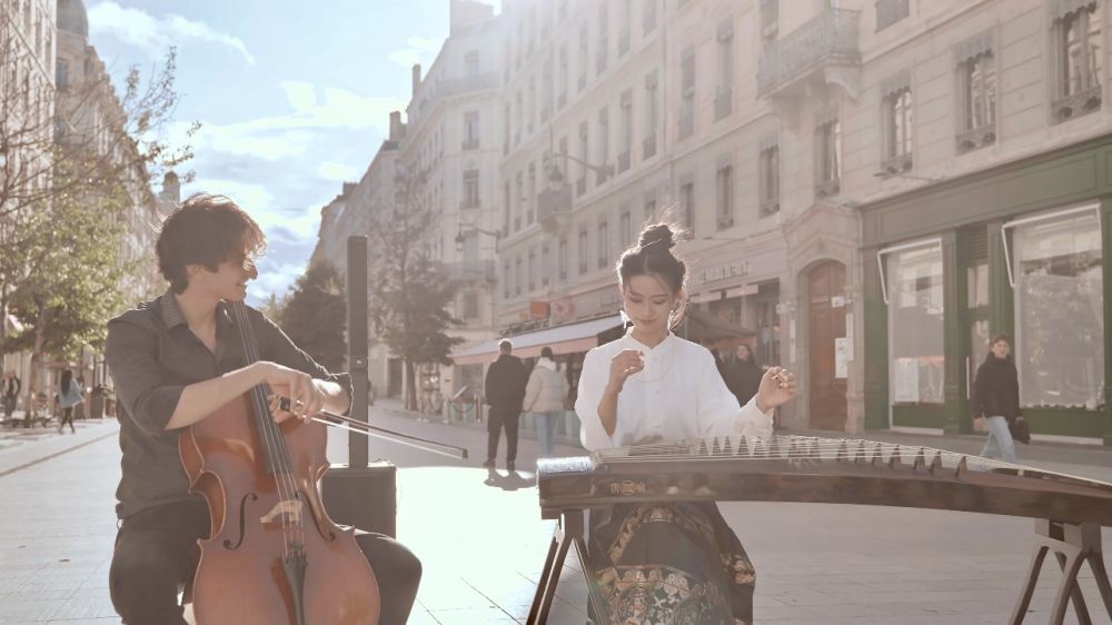 去年冬天,彭靜旋邀請法國大提琴家菲利克斯一起合作。一個是低頻濃厚的線狀樂器,一個是高頻清亮的點狀樂器,在陽光明媚的下午,一首《浮光》在里昂街頭奏響。