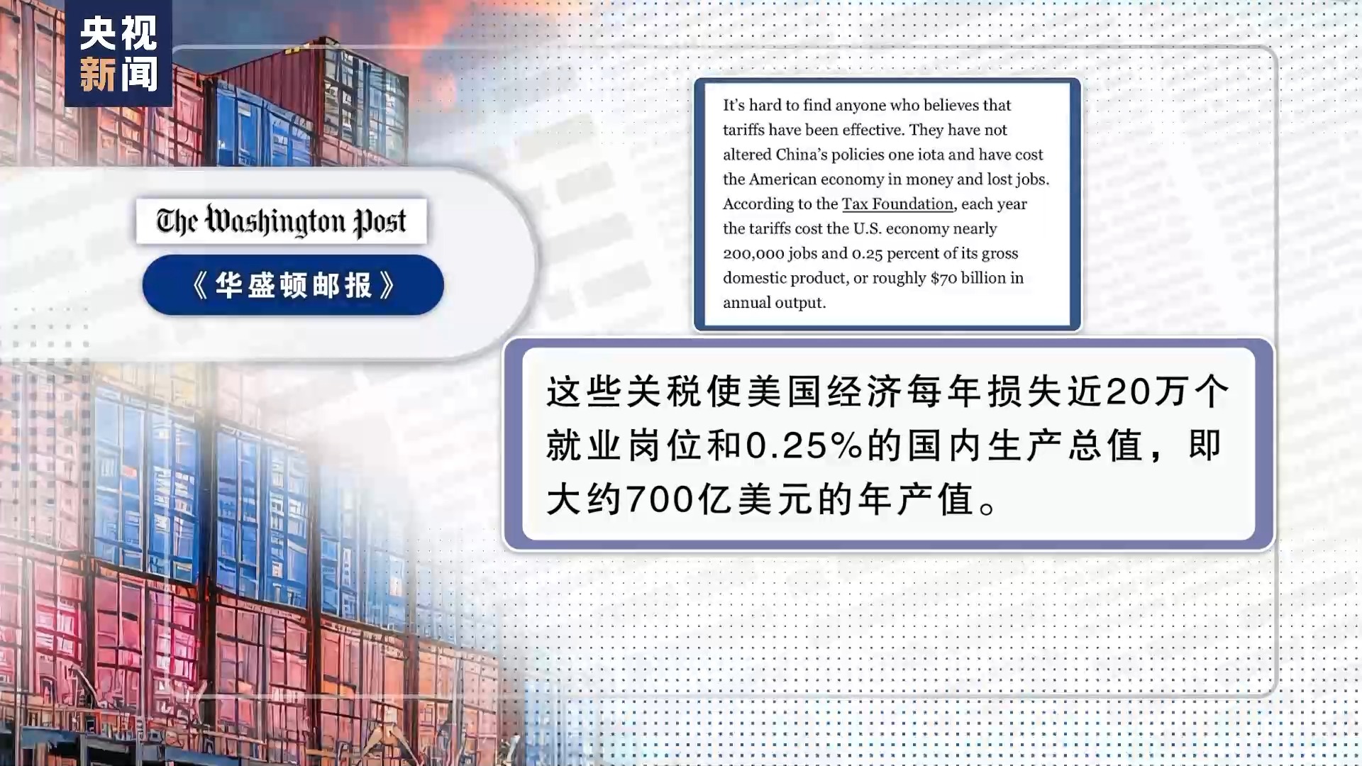 另據(jù)美國《華盛頓郵報》4月援引美國稅務(wù)基金會的數(shù)據(jù),這些關(guān)稅使美國經(jīng)濟每年損失近20萬個就業(yè)崗位和0.25%的國內(nèi)生產(chǎn)總值,即大約700億美元的年產(chǎn)值。