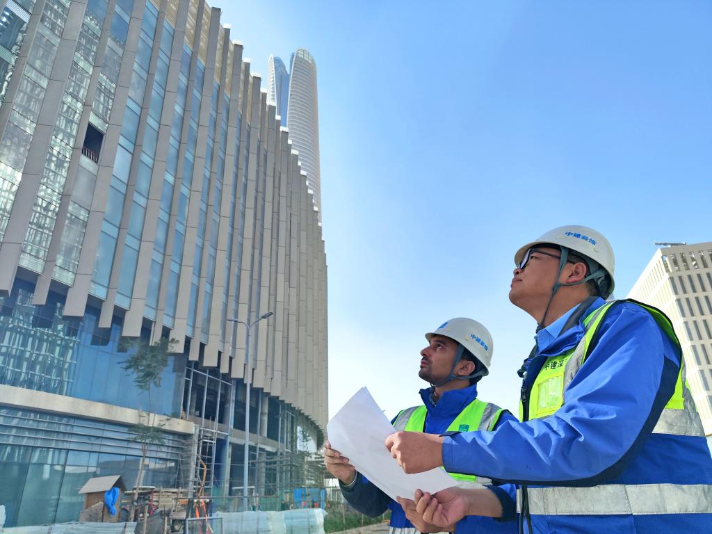 2023年11月27日,中建深圳裝飾有限公司項(xiàng)目經(jīng)理徐笑笑(右)與來自埃及的幕墻工程師艾哈邁德·賽義德在埃及開羅以東的埃及新行政首都中央商務(wù)區(qū)施工現(xiàn)場(chǎng)一同查看幕墻安裝進(jìn)度(手機(jī)拍攝)。新華社發(fā)(中建深圳裝飾有限公司供圖)