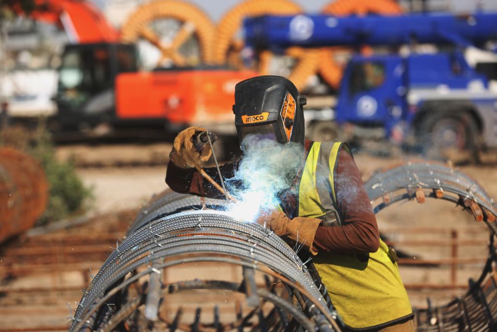 3月2日,一名中方員工在伊拉克巴格達(dá)尼蘇爾立體交通樞紐項(xiàng)目現(xiàn)場(chǎng)施工作業(yè)。新華社發(fā)(哈利勒·達(dá)伍德攝)