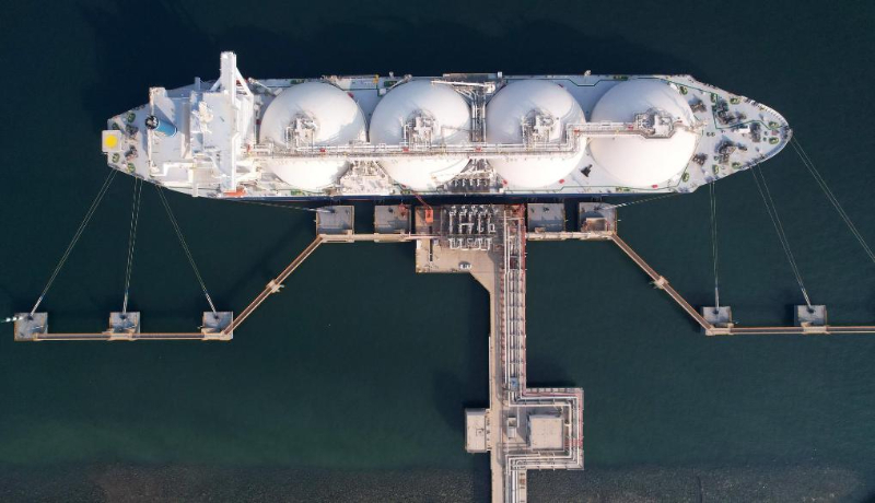 2022年10月21日,一艘液化天然氣運輸船靠泊在中國石化天津LNG接收站“1號泊位”進行卸船作業(yè)(無人機照片)。新華社記者趙子碩攝