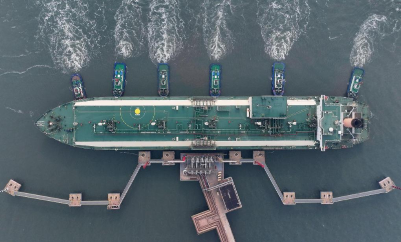 2023年11月15日,來自卡塔爾的“阿爾達夫那”號LNG輪在拖輪的協(xié)助下向唐山港曹妃甸港區(qū)中國石油唐山LNG接收站碼頭靠泊(無人機照片)。新華社記者楊世堯攝