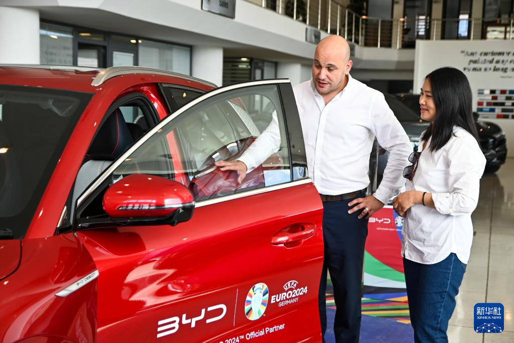 2024年5月29日,在馬耳他比爾基卡拉,馬耳他哈桑-扎米特汽車公司首席執(zhí)行官德古阿拉(左)介紹一輛比亞迪純電動(dòng)汽車。新華社發(fā)(喬納森·博格 攝)