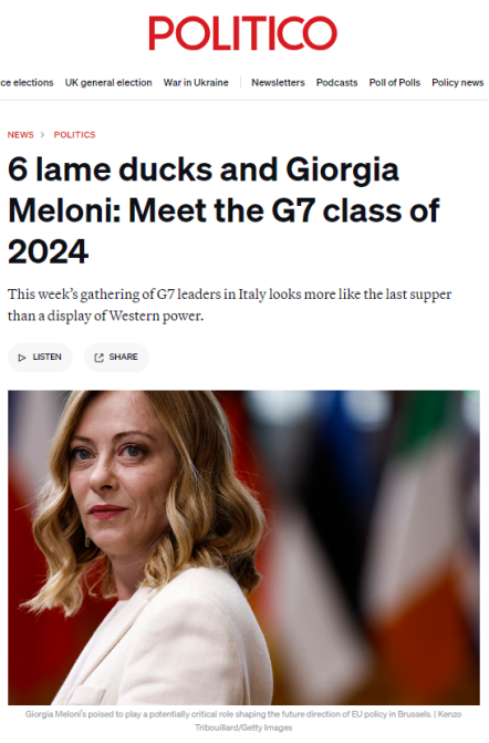 面對各自國內(nèi)嚴(yán)峻的政治形勢,本次G7峰會開得真有些力不從心、心猿意馬。法德兩國領(lǐng)導(dǎo)人所在政黨在上周剛剛結(jié)束的歐洲議會選舉中表現(xiàn)堪憂;英國首相蘇納克更在朝不保夕中擔(dān)憂著自己的保守黨會在下月初大選中走到窮途末路;美國總統(tǒng)拜登更是處處遭逢著大選對手特朗普的咄咄逼人。美國政客新聞網(wǎng)歐洲版(Politico.eu)捕捉到了這種有趣的心不在焉的會議氛圍,以《六只跛腳鴨和梅洛尼》為題諷刺總結(jié)本次峰會,“在意大利舉行的七國集團峰會看起來更像是最后的晚餐,而不是西方力量的展示”。