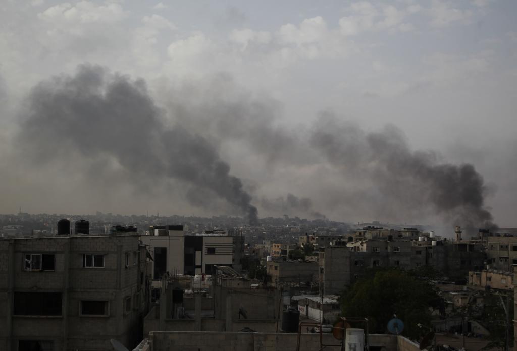 以色列陸軍坦克5月28日開進(jìn)加沙地帶南部城市拉法市中心。圖為拉法當(dāng)天在以軍密集轟炸期間升起濃煙。新華社發(fā)(哈立德·奧馬爾攝)