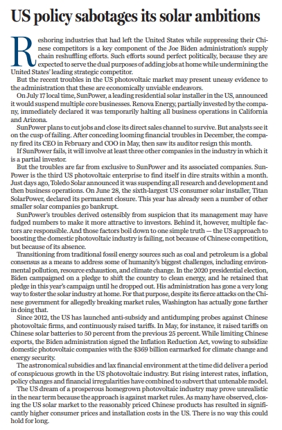 原標題:US policy sabotages its solar ambitions
