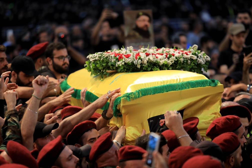 8月1日,在黎巴嫩首都貝魯特,真主黨成員參加真主黨高級軍事指揮官福阿德·舒庫爾的葬禮。新華社發(fā)(比拉爾·賈維希攝)
