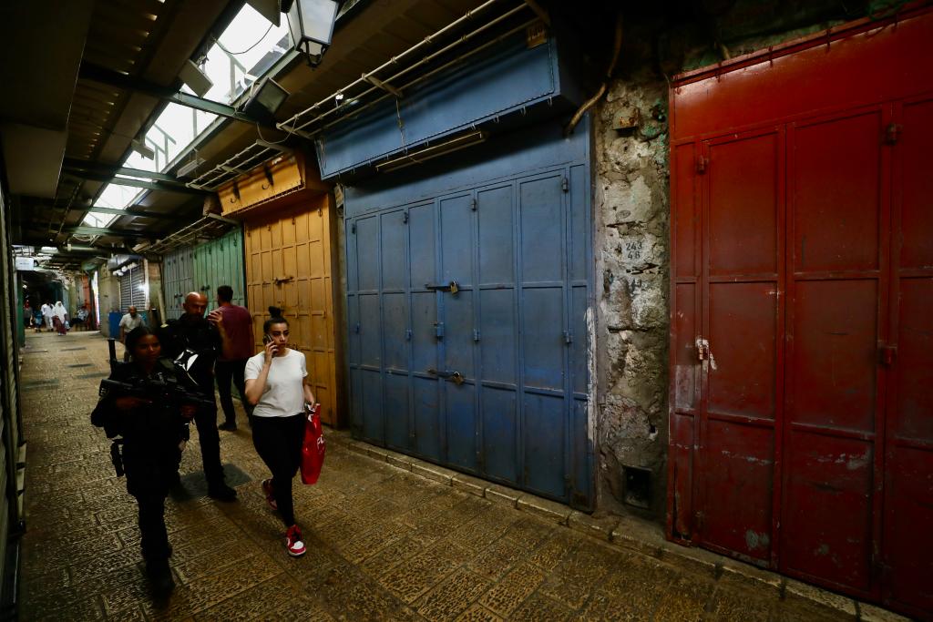 7月31日,在耶路撒冷老城,行人經(jīng)過關(guān)門的店鋪。當(dāng)日,耶路撒冷老城商戶舉行罷市,抗議哈馬斯領(lǐng)導(dǎo)人伊斯梅爾·哈尼亞遇襲身亡。新華社發(fā)(賈馬爾·阿瓦德攝)