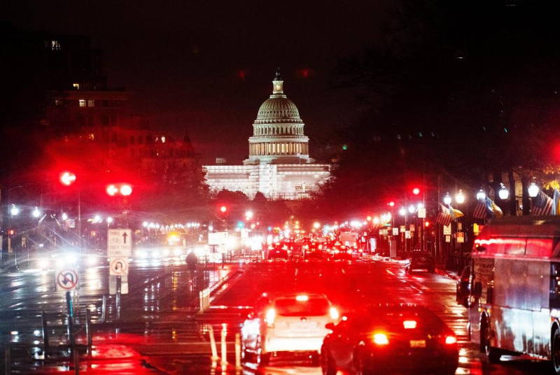 這是2022年12月22日在美國(guó)華盛頓拍攝的雨中的車輛和國(guó)會(huì)大廈。新華社記者劉杰攝