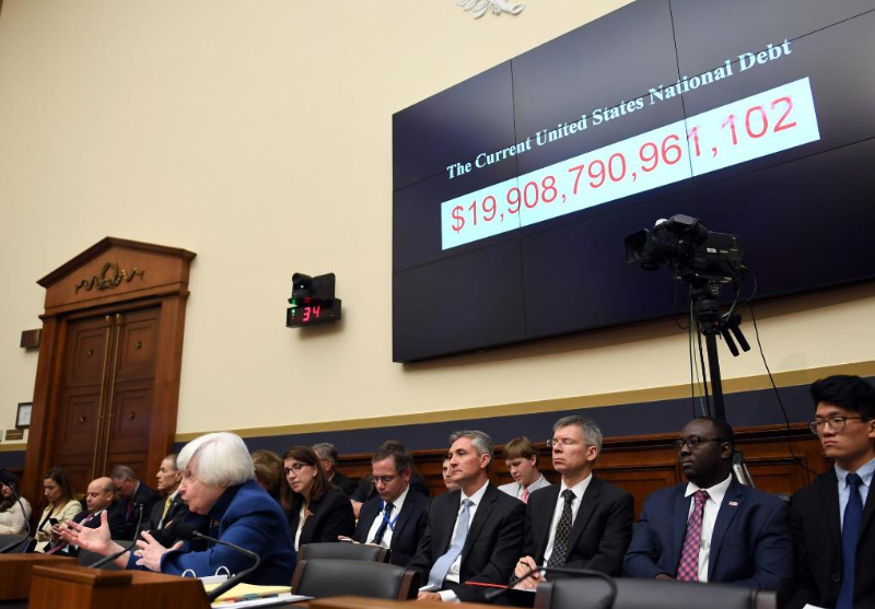 2017年7月12日,時(shí)任美國(guó)聯(lián)邦儲(chǔ)備委員會(huì)主席耶倫(前)在華盛頓出席國(guó)會(huì)聽(tīng)證會(huì),屏幕顯示美國(guó)當(dāng)時(shí)的國(guó)債近20萬(wàn)億美元。新華社記者殷博古攝
