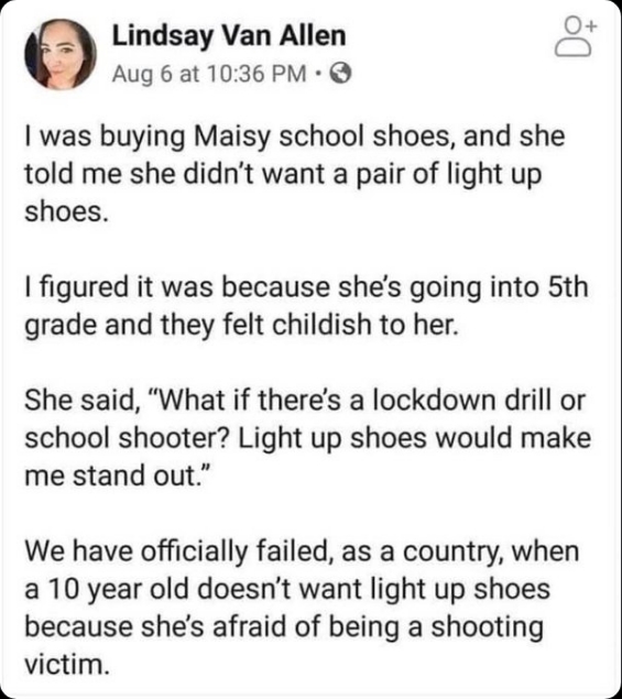 然而,梅茜這樣做的真實原因卻令人十分痛心。林賽寫道:“她說‘如果進行封鎖演習或者發(fā)生校園槍擊事件怎么辦?發(fā)光的鞋子會讓我更引起注意。’”這個孩子非常擔心發(fā)生校園槍擊事件,以致于她不得不放棄每個孩子都想要的LED發(fā)光鞋。