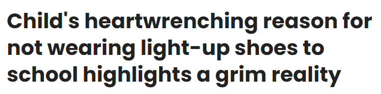 文章提到,一位名叫林賽·范·艾倫(Lindsay Van Allen)的母親在一篇帖子中講述了給上五年級的女兒梅茜(Maisy)買新校鞋時發(fā)生的事情。“在我給梅茜買上學穿的鞋時,她跟我說不想要能發(fā)光的鞋子?!彼f,當女兒特別強調一定不要買那雙可愛又新奇的LED發(fā)光鞋的時候,她以為這是因為孩子長大了,要上五年級了,不想讓自己看起來很幼稚。