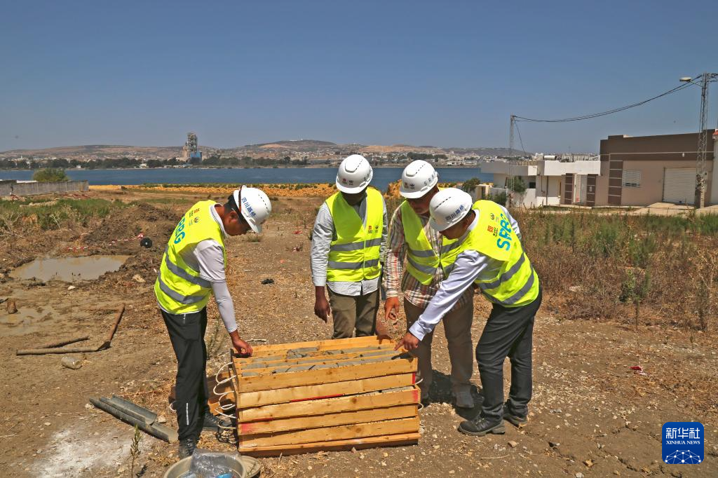 8月12日,在突尼斯比塞大,四川公路橋梁建設(shè)集團(tuán)有限公司工作人員與突尼斯工程師在比塞大運河附近進(jìn)行地質(zhì)勘探工作。 新華社發(fā)(阿代爾攝)