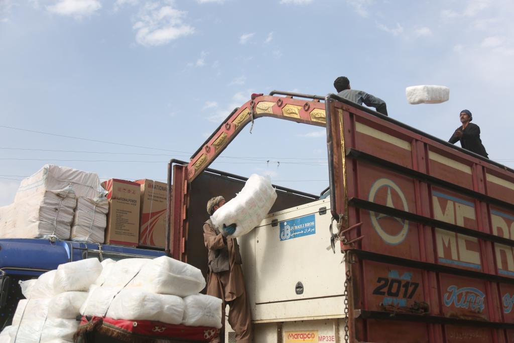 8月24日,在阿富汗首都喀布爾,工人向貨車內(nèi)裝載貨物。新華社發(fā)(塞夫拉赫曼·薩菲 攝)