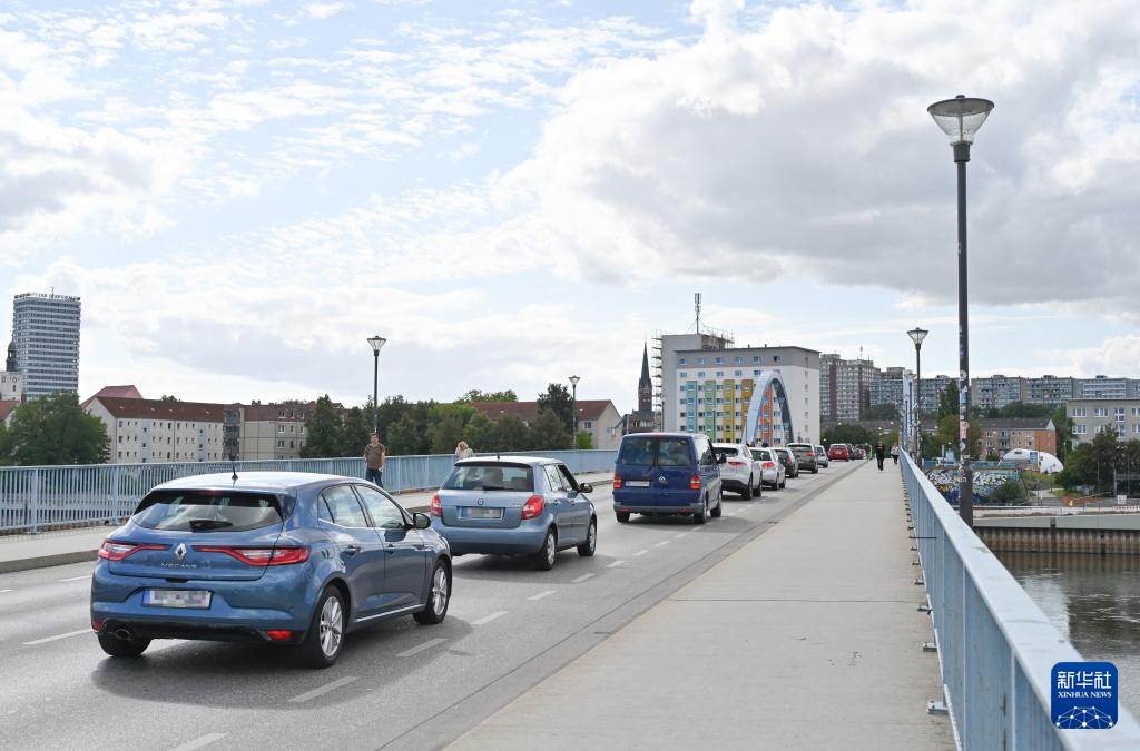 9月10日,車輛在連接德國奧得河畔法蘭克福和波蘭斯武比采的跨河大橋上排隊,等待進入德國。新華社記者 任鵬飛 攝