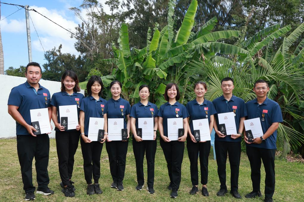 7月30日,在瓦努阿圖首都維拉港,中國援瓦醫(yī)療隊隊員手持證書合影。瓦努阿圖總統(tǒng)武羅巴拉武當(dāng)天向中國醫(yī)療隊9名隊員頒發(fā)“國家勛章”,以表彰他們?yōu)樘嵘哚t(yī)療衛(wèi)生服務(wù)水平、鞏固瓦中兩國醫(yī)療衛(wèi)生合作作出的卓越貢獻(xiàn)。新華社發(fā)(中國援瓦醫(yī)療隊供圖)