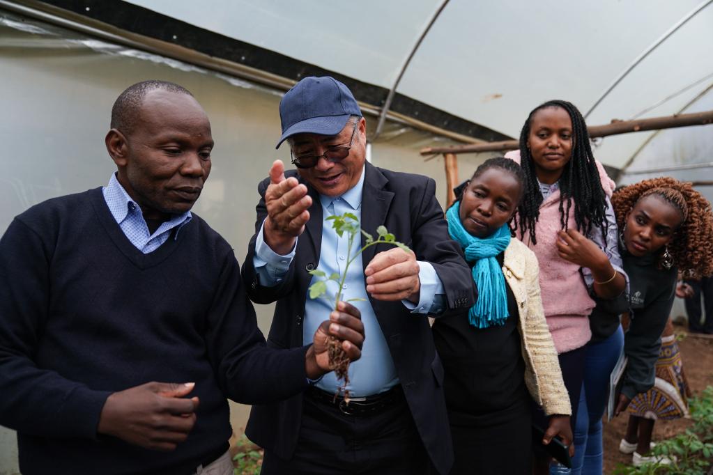 2023年9月18日,在肯尼亞納庫(kù)魯郡舉辦的中非農(nóng)業(yè)發(fā)展和減貧示范村番茄生產(chǎn)培訓(xùn)班上,來(lái)自中國(guó)的農(nóng)學(xué)教授劉高瓊(左二)為肯方學(xué)員指導(dǎo)農(nóng)業(yè)技術(shù)。新華社記者 韓旭 攝