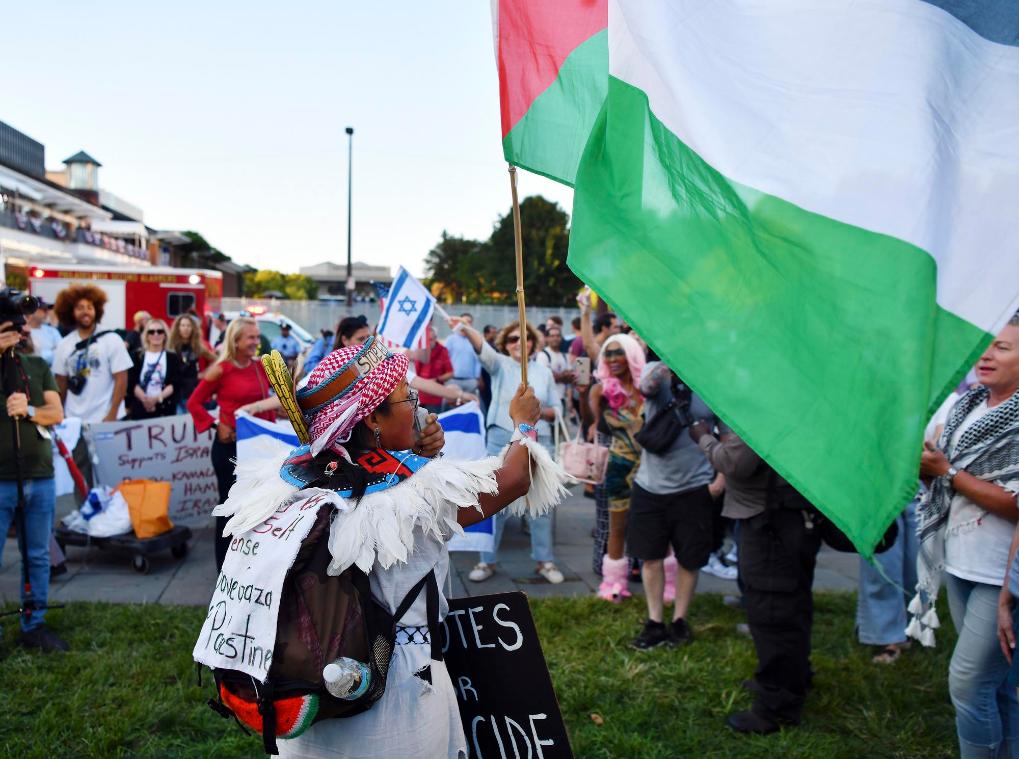 9月10日,示威者在美國費城舉行電視辯論的國家憲法中心附近抗議。新華社記者李睿攝