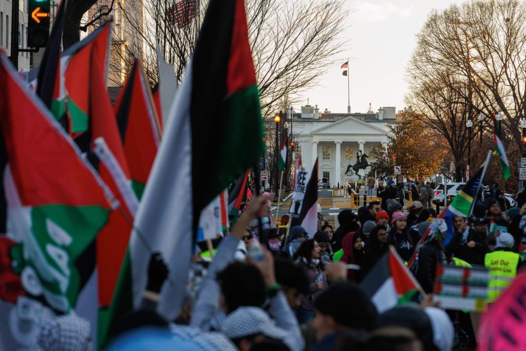 1月13日,在美國首都華盛頓,人們參加聲援巴勒斯坦的集會游行活動。大批示威者揮舞旗幟和標(biāo)語,高喊口號聲援巴勒斯坦,呼吁?;稹P氯A社發(fā)(亞倫攝)