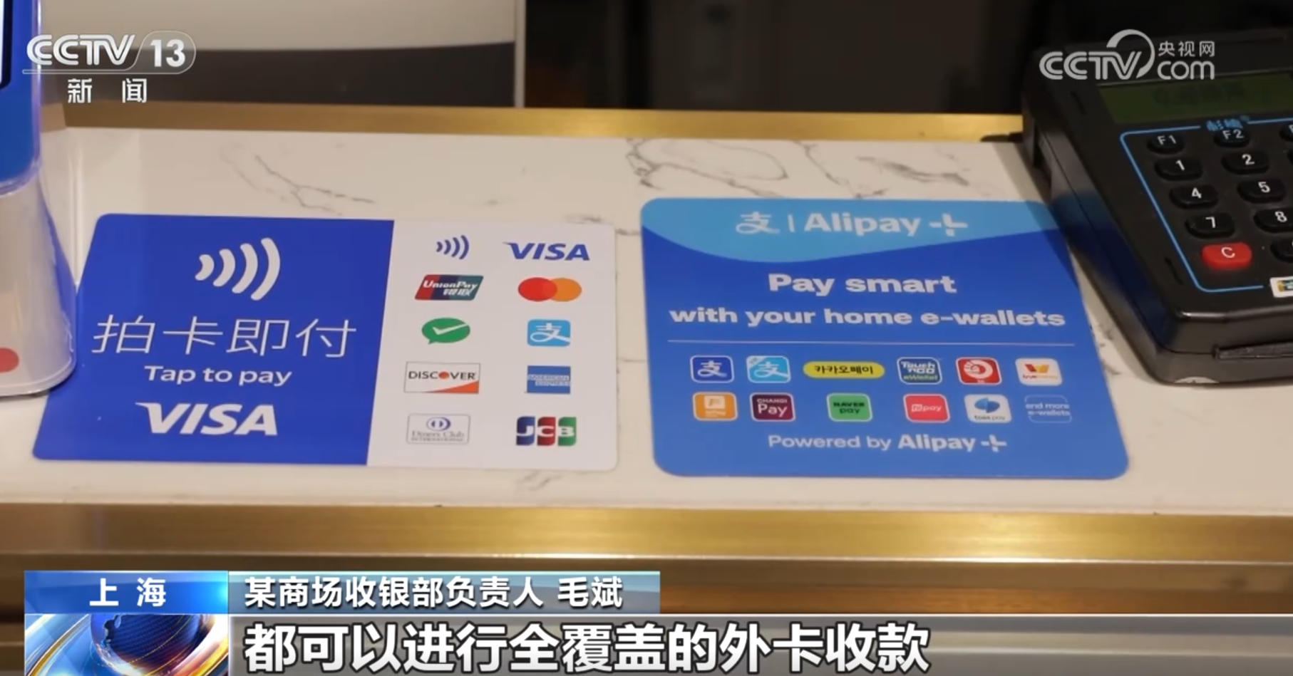 某商場(chǎng)收銀部負(fù)責(zé)人毛斌稱:“外國(guó)顧客到我們商場(chǎng)購(gòu)物越來(lái)越多了,所以我們針對(duì)外國(guó)顧客的付款方式進(jìn)行了收銀方面的調(diào)整改進(jìn),目前商場(chǎng)所有的收銀設(shè)備都可以進(jìn)行全覆蓋的外卡收款。”