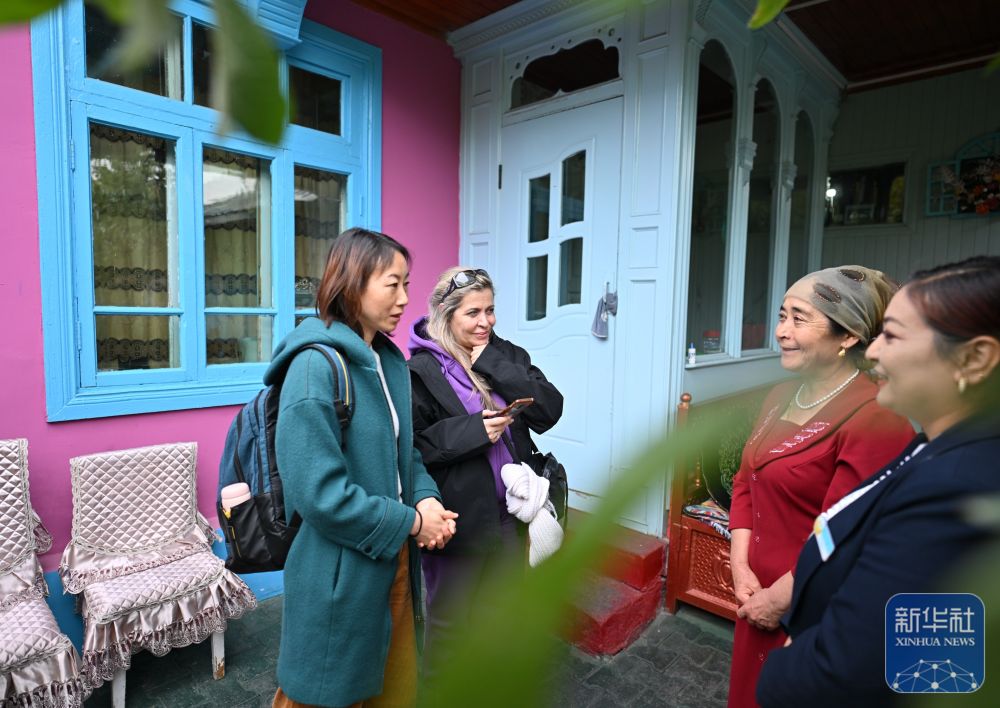 10月15日,與會嘉賓在吐魯番市高昌區(qū)亞爾鎮(zhèn)新城片區(qū)新城西門村參訪時與當?shù)鼐用窠涣鳌?新華社記者 李明 攝