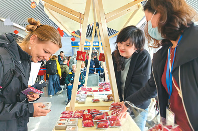 入境游客在上海吳淞口國際郵輪港到達(dá)大廳設(shè)立的攤位前駐足,了解文創(chuàng)產(chǎn)品。新華社記者 陳愛平攝