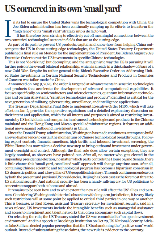 此前,外界普遍認為美國正在放棄“正和”的世界觀。10月23日,美國總統(tǒng)國家安全事務(wù)助理沙利文在布魯金斯學會上發(fā)言時否認了這一說法。隨后,美國財政部在發(fā)布最終規(guī)則時也表示,美國致力于建設(shè)“開放的投資環(huán)境”。然而,最終規(guī)則的發(fā)布,終究讓美國的“言”與“行”背道而馳。