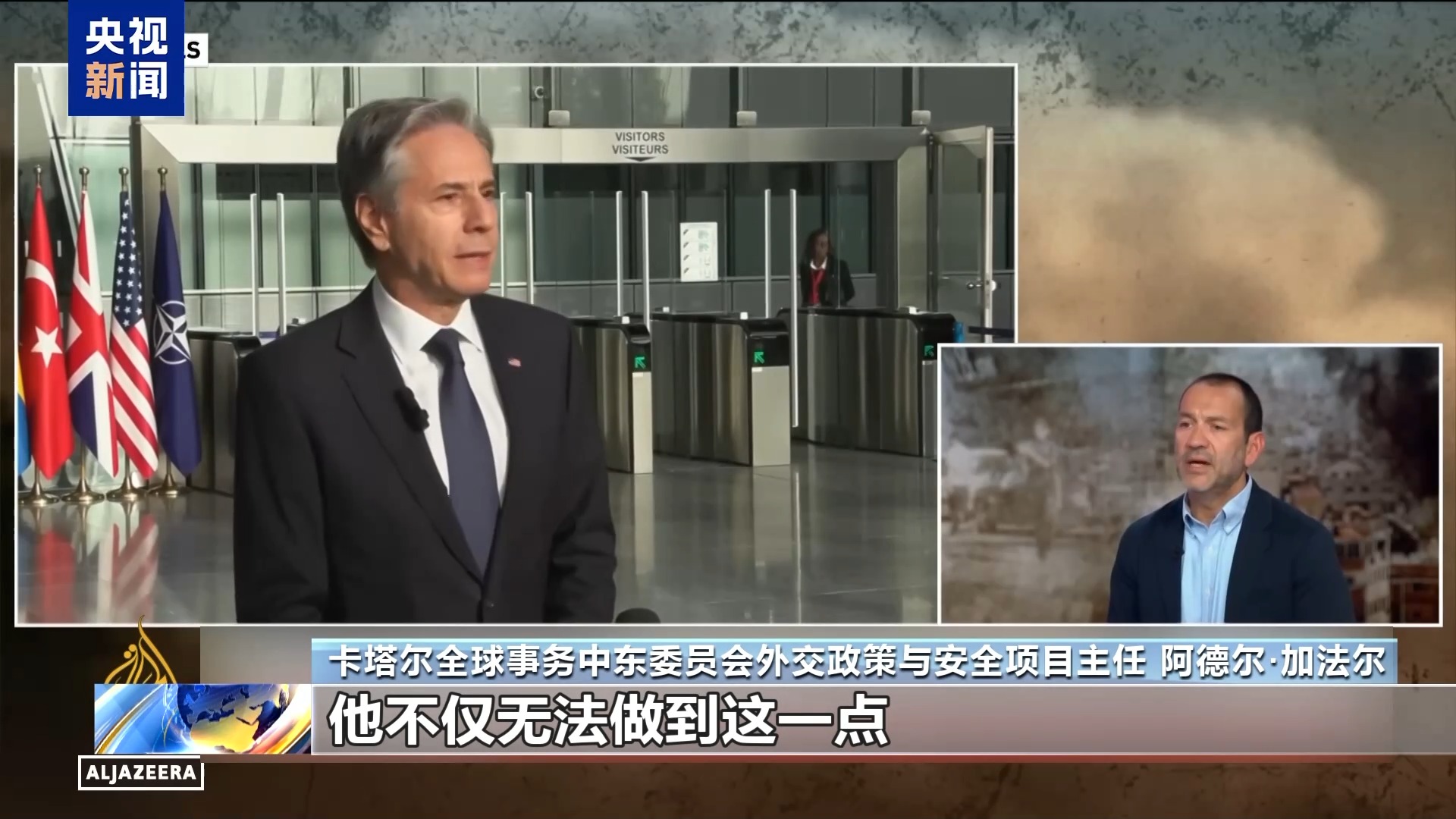卡塔爾全球事務中東委員會外交政策與安全項目主任 阿德爾·加法爾:過去一年多布林肯已經(jīng)去了中東至少11次,和中東國家領(lǐng)導人會面,他試圖推動以色列結(jié)束戰(zhàn)爭,但到目前為止,他不僅無法做到這一點,而且美國還在外交政策上偏袒以色列,不斷提供武器和資金支持。