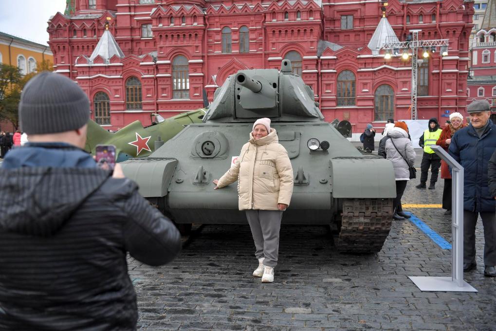 11月7日,在俄羅斯首都莫斯科,一名女子在以紀念1941年蘇聯紅場閱兵式為主題的露天展覽上留影。新華社發(fā)(亞歷山大攝)