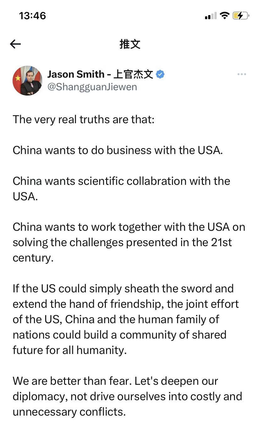 他在推特中稱,“真正的事實是,中國愿意與美國做買賣、進行科學(xué)合作,并共同解決21世紀面臨的挑戰(zhàn)。如果美國能夠停止敵對行動,并伸出友誼之手,中美兩國和全人類大家庭可以共同努力構(gòu)建人類命運共同體。我們比恐懼更強大,讓我們深化外交關(guān)系,避免陷入代價高昂且不必要的沖突中。”