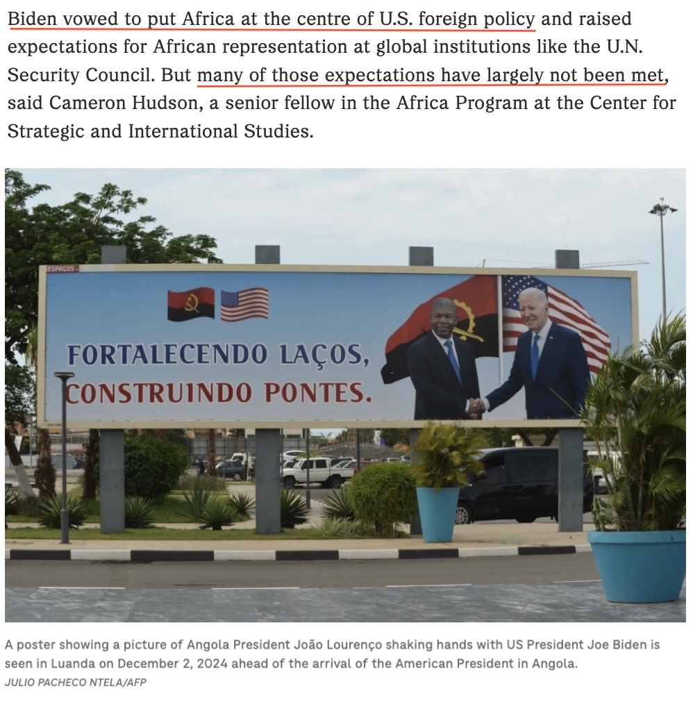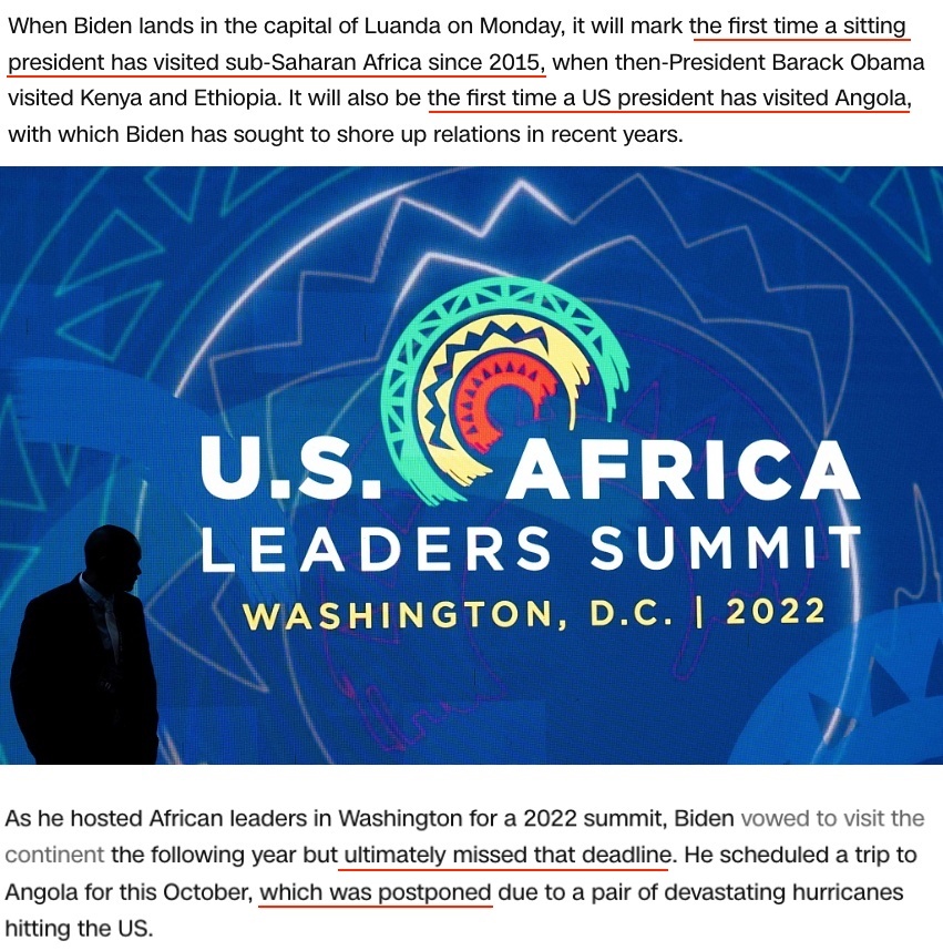 △美國(guó)有線電視新聞網(wǎng)報(bào)道:這是一場(chǎng)拖了太久的訪問(wèn)。2022年在華盛頓舉行的美非峰會(huì)上,拜登曾承諾2023年訪問(wèn)非洲,但他食言了。即便是這次原本安排在10月的安哥拉之行也因美國(guó)國(guó)內(nèi)發(fā)生颶風(fēng)災(zāi)害而推遲。
