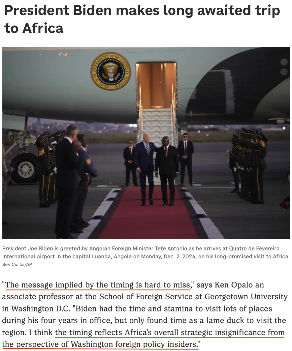 美國(guó)華盛頓特區(qū)喬治城大學(xué)外交學(xué)院副教授肯·奧帕羅認(rèn)為,拜登在即將卸任時(shí)才抽出時(shí)間訪問(wèn)非洲地區(qū),“從華盛頓外交政策內(nèi)部人士的角度來(lái)看,這個(gè)時(shí)機(jī)反映了非洲在美國(guó)總體戰(zhàn)略中的不重要性”。
