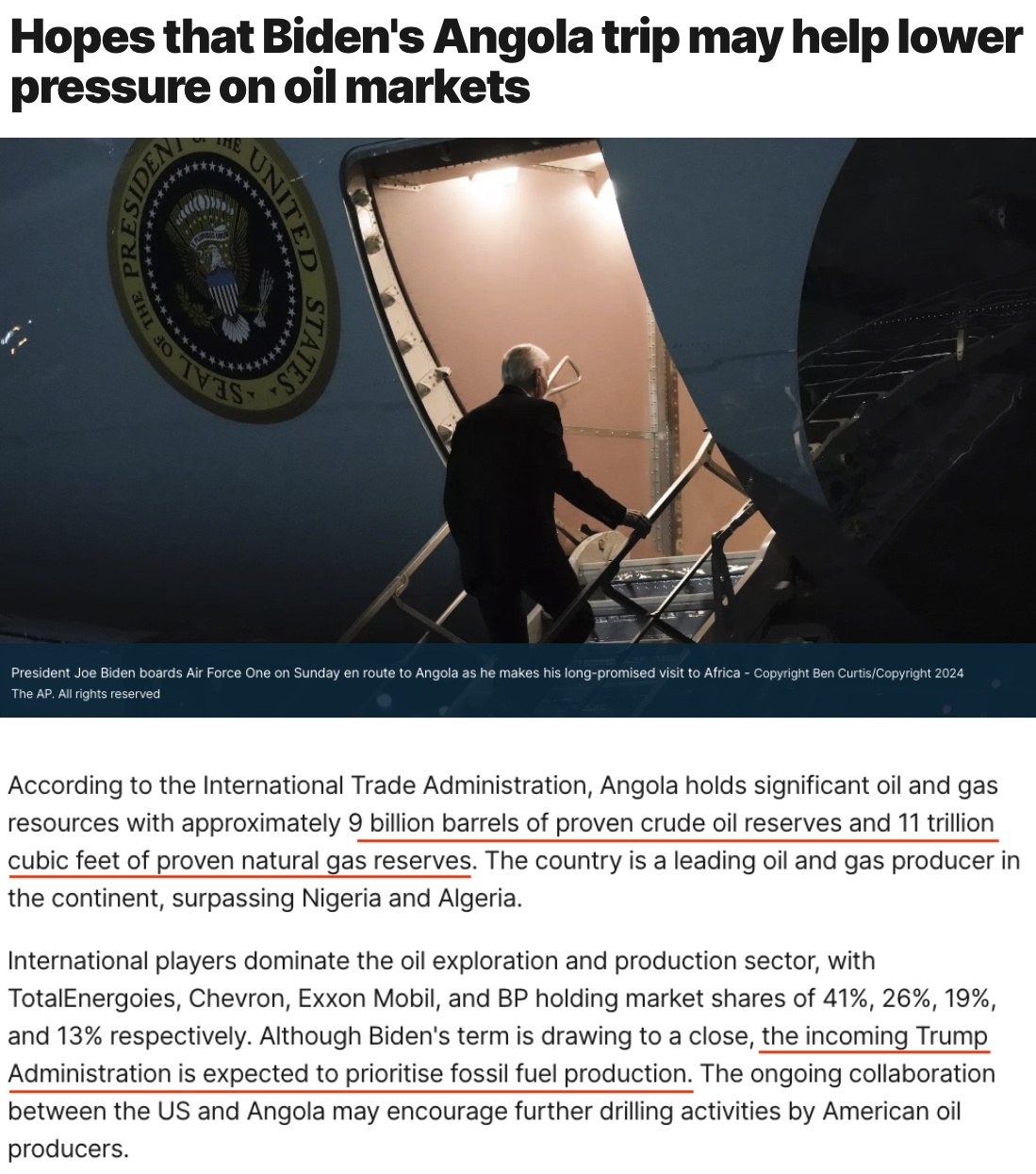 雖然拜登的任期即將結(jié)束,但預(yù)計(jì)即將上任的特朗普政府將優(yōu)先考慮化石燃料生產(chǎn)。美國(guó)和安哥拉之間正在進(jìn)行的合作可能會(huì)鼓勵(lì)美國(guó)石油生產(chǎn)商進(jìn)一步開(kāi)展鉆探活動(dòng)。