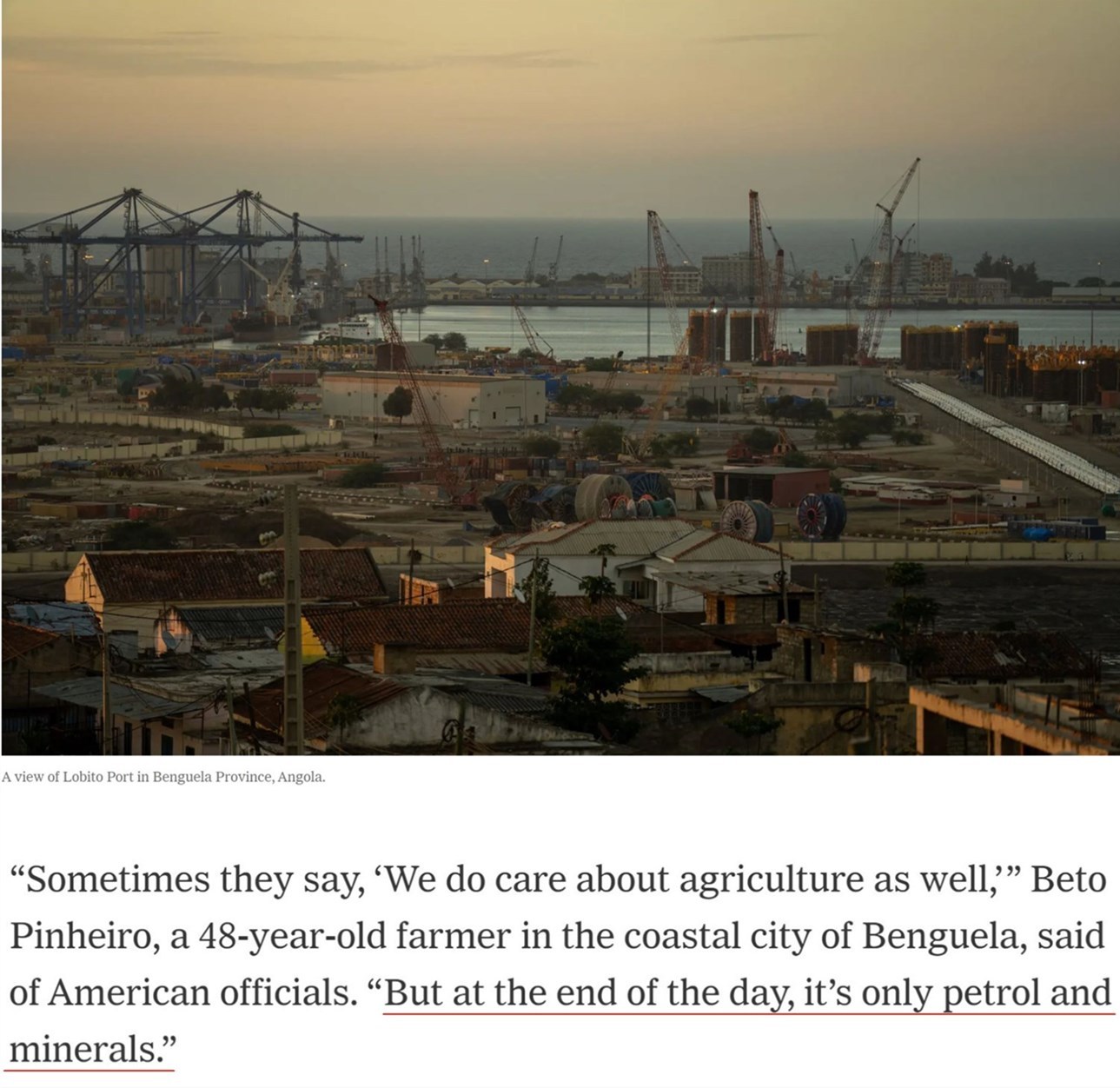 家住安哥拉沿海城市本格拉的48歲農(nóng)民貝托·皮涅羅說(shuō):“有時(shí)他們(美國(guó)官員)會(huì)說(shuō),‘我們也關(guān)心(安哥拉的)農(nóng)業(yè)’……但歸根結(jié)底,(美國(guó)關(guān)心的)只有石油和礦產(chǎn)。”