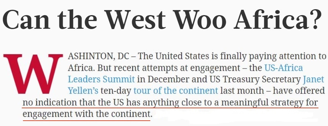 △世界報(bào)業(yè)辛迪加網(wǎng)站:雖然非洲以其快速增長(zhǎng)的人口、豐富的資源以及龐大的聯(lián)合國(guó)會(huì)員國(guó)席位數(shù)目重新受到了美國(guó)的關(guān)注,但沒(méi)有任何跡象表明美國(guó)已制定出與非洲加強(qiáng)接觸的有意義的戰(zhàn)略。