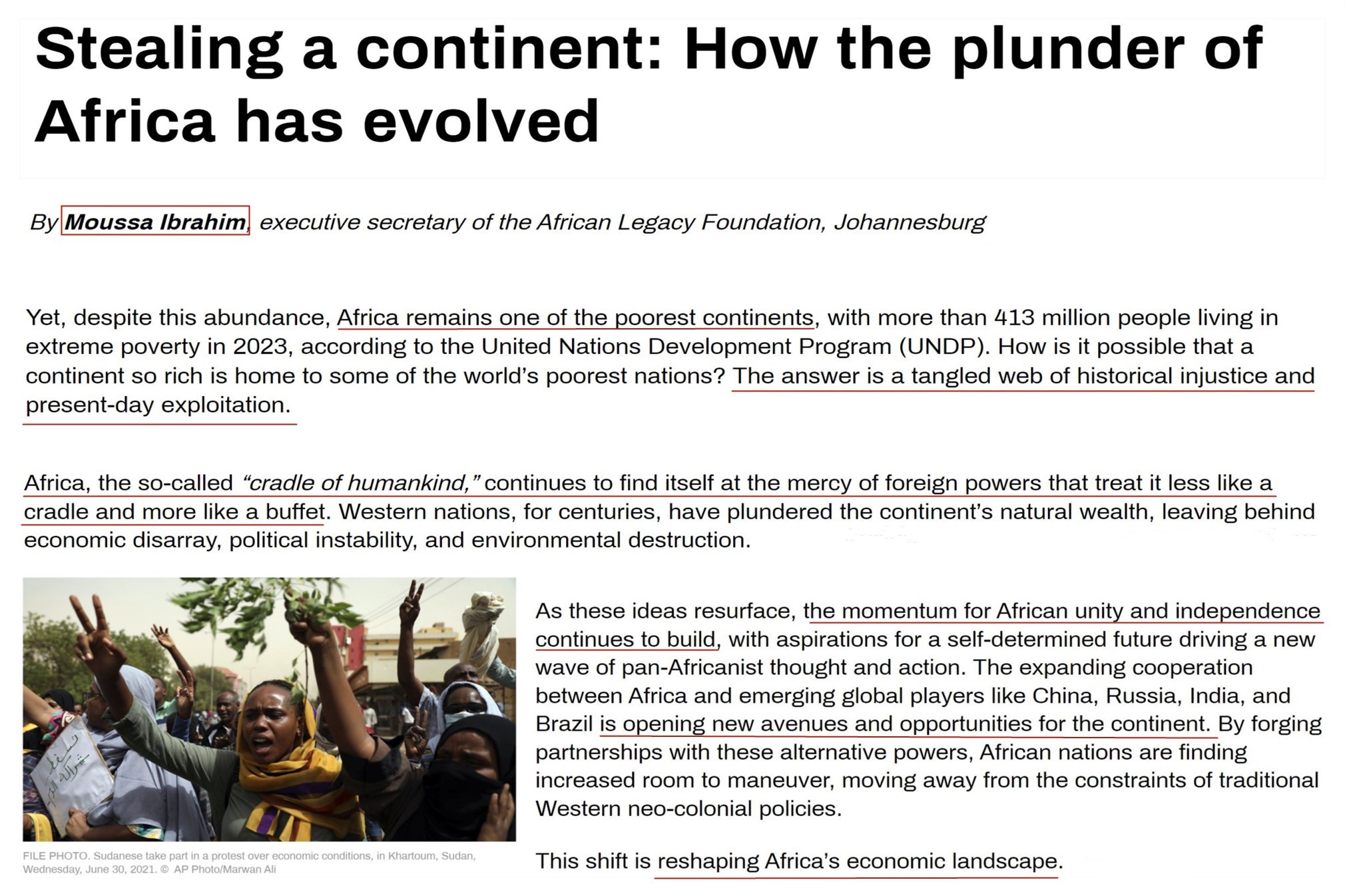 非洲遺產(chǎn)基金會(huì)執(zhí)行秘書(shū)穆薩·易卜拉欣發(fā)文指出,盡管非洲自然資源豐富,但仍是最貧窮的大陸。時(shí)至今日,非洲這個(gè)人類(lèi)搖籃仍受到外國(guó)列強(qiáng)的擺布,西方對(duì)非洲自然資源的劫掠只不過(guò)換了包裝。