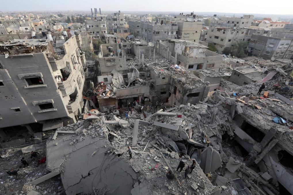 12月7日,在加沙地帶中部努賽賴(lài)特難民營(yíng),人們走過(guò)以軍轟炸后的建筑廢墟。新華社發(fā)(里澤克·阿卜杜勒賈瓦德攝)