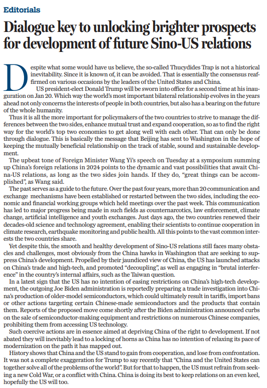 因此,雙方應當努力管控分歧、增信釋疑、拓展合作,為世界前兩大經濟體開辟友好相處、共同發(fā)展的道路。這只能通過對話溝通來實現(xiàn)。