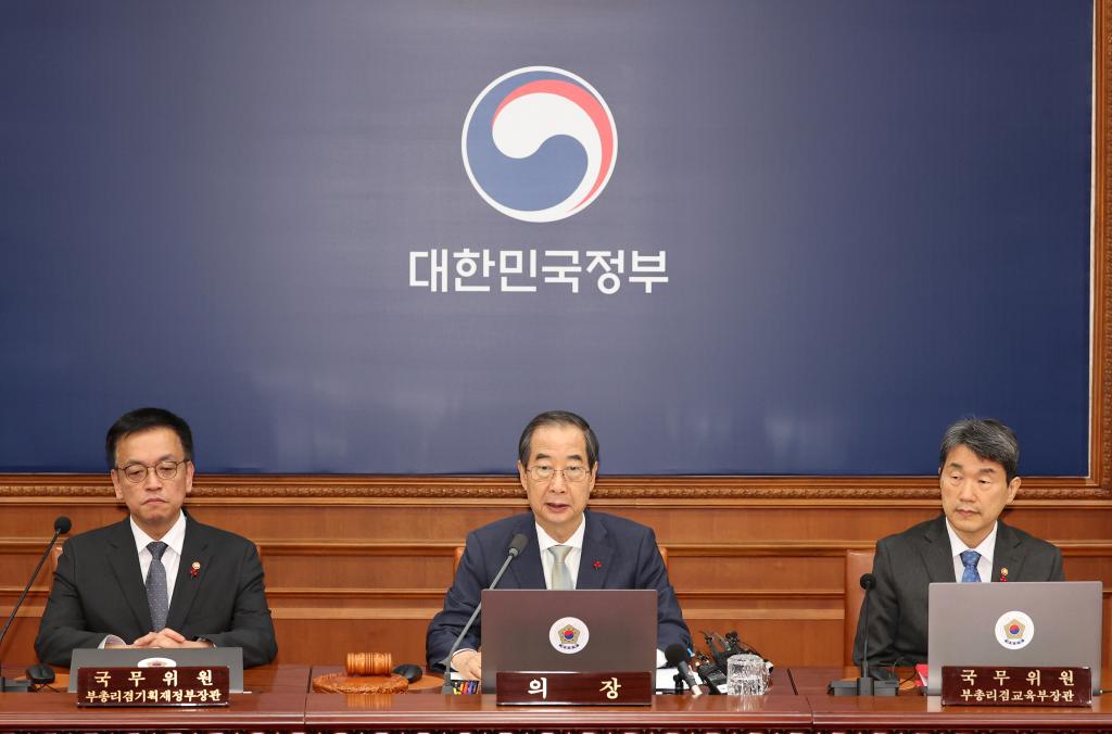 12月14日,在韓國(guó)首都首爾,代行總統(tǒng)職權(quán)的韓國(guó)國(guó)務(wù)總理韓德洙(中)召開(kāi)臨時(shí)國(guó)務(wù)會(huì)議。新華社/紐西斯通訊社