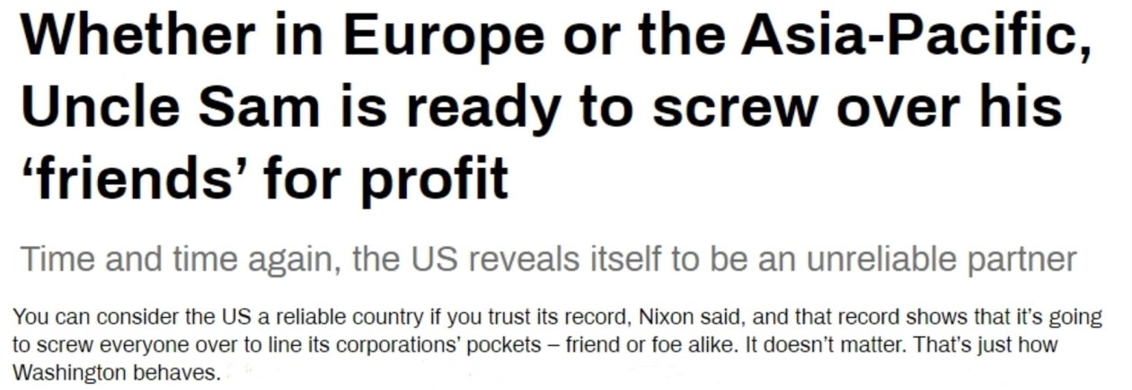 正如美國(guó)電臺(tái)主持人、政治分析家加蘭·尼克松在一篇文章中所說(shuō),歷史記錄表明,“美國(guó)為了本國(guó)公司的利益會(huì)坑害所有人——無(wú)論朋友還是敵人。這就是華盛頓的行為方式”。