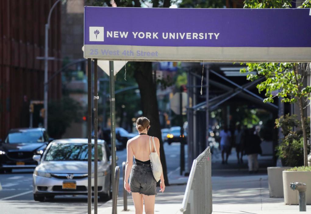 2020年7月14日,一名女子從美國(guó)紐約大學(xué)的教學(xué)樓前走過。新華社記者王迎攝