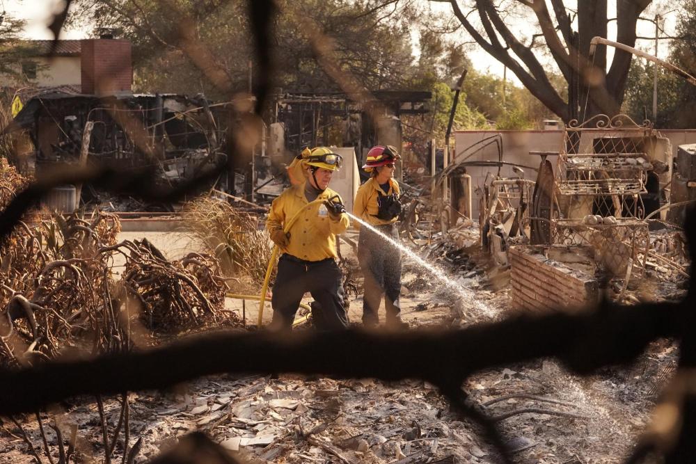 1月10日,在美國加利福尼亞州洛杉磯縣阿爾塔迪納地區(qū),消防員正在努力撲滅山火過后建筑周圍的熱點(diǎn)區(qū)域。新華社發(fā)(曾慧攝)