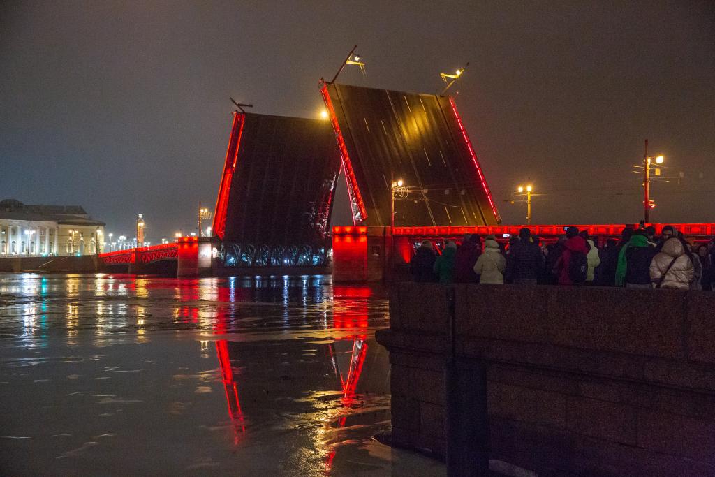 1月29日凌晨,在俄羅斯圣彼得堡,人們?cè)谀吆优嫌^看亮起“中國(guó)紅”的冬宮橋開橋。新華社發(fā)(莫京娜攝)