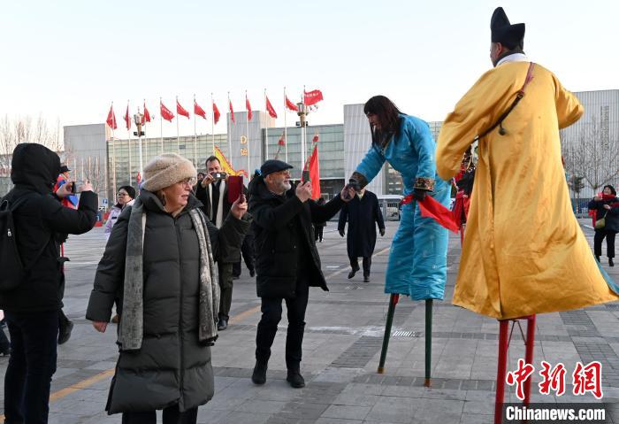 2月7日,駐華使節(jié)團(tuán)成員與踩高蹺表演者交流。中新社記者 翟羽佳 攝