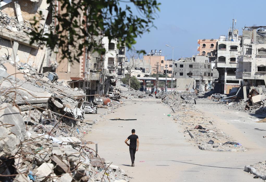 2024年10月9日,在加沙地帶北部杰巴利耶,一名男子從建筑廢墟旁走過(guò)。新華社發(fā)(阿卜杜勒拉赫曼·薩拉馬攝)
