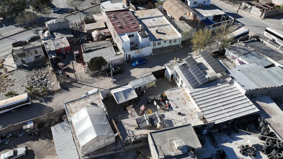 這是2025年2月2日在墨西哥奇瓦瓦州華雷斯城拍攝的一處移民收容所(無人機(jī)照片)。新華社記者 李夢(mèng)馨 攝