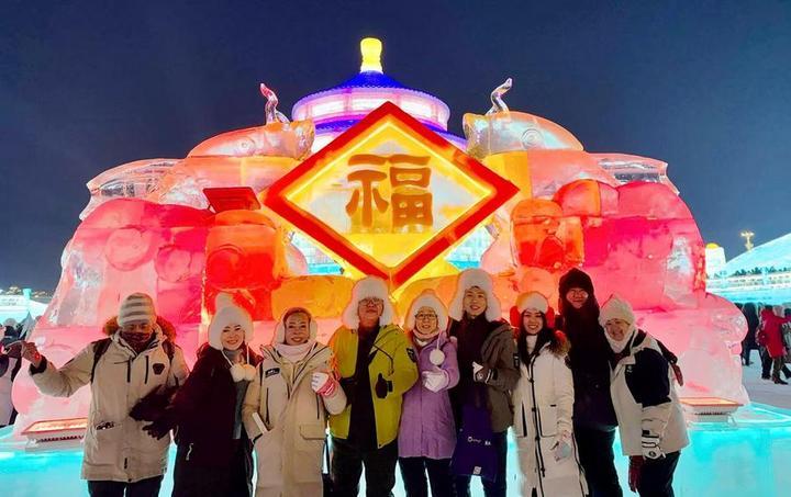 2月1日,馬來西亞游客陳新全(右四)在黑龍江省哈爾濱冰雪大世界游玩時(shí)與旅行團(tuán)友合影(受訪者提供)。
