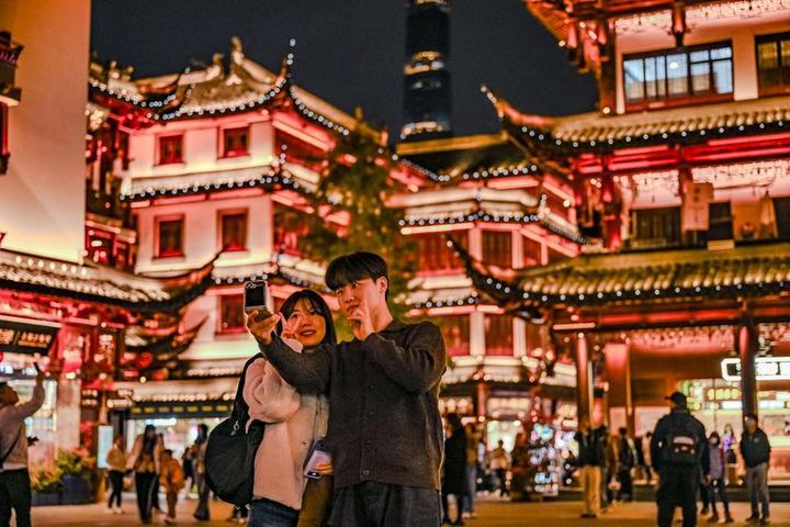 2024年12月4日,來自韓國的游客在上海豫園商城自拍。新華社發(fā)(陳浩明攝)